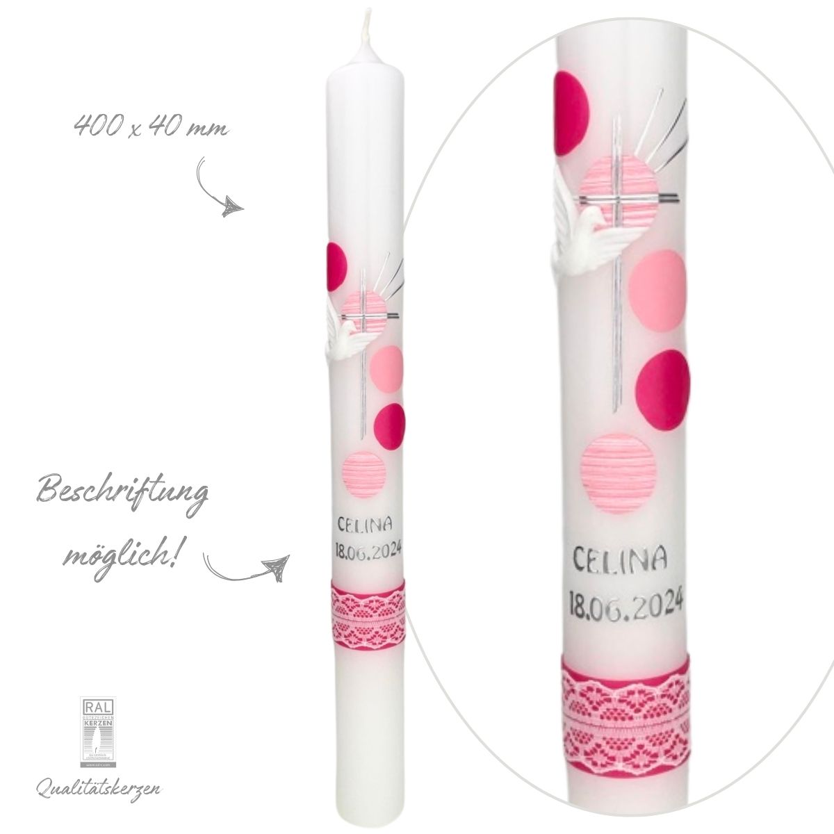 Kommunionskerze - Taufkerze Pünktchen Rosa Pink Hellrosa für Mädchen - 40x4