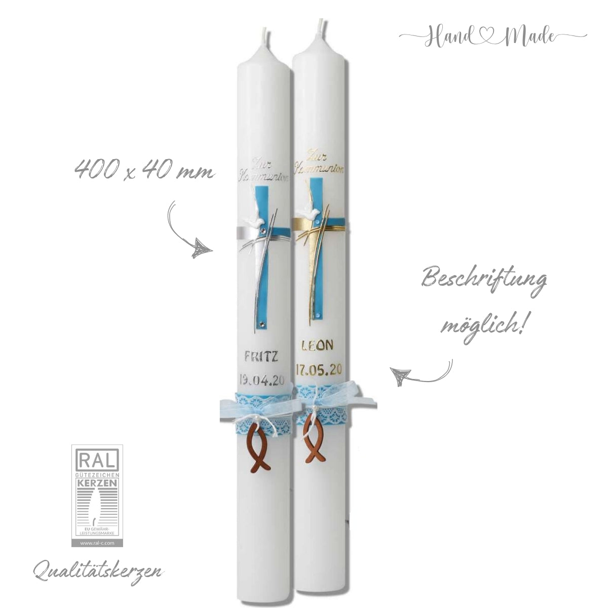 Vintage-Kommunionkerzen Taufkerzen Blau für Jungen | Fisch - 40x4